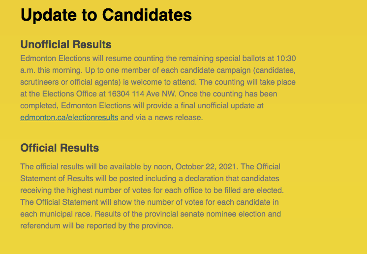 Edmonton Elections will only report the unofficial and official results from the municipal and school board trustee races. By admin987 Oct 19 2021. The 2021 Edmonton election campaign comes to an end on Monday night and Global News will have live coverage of the results the moment the polls.